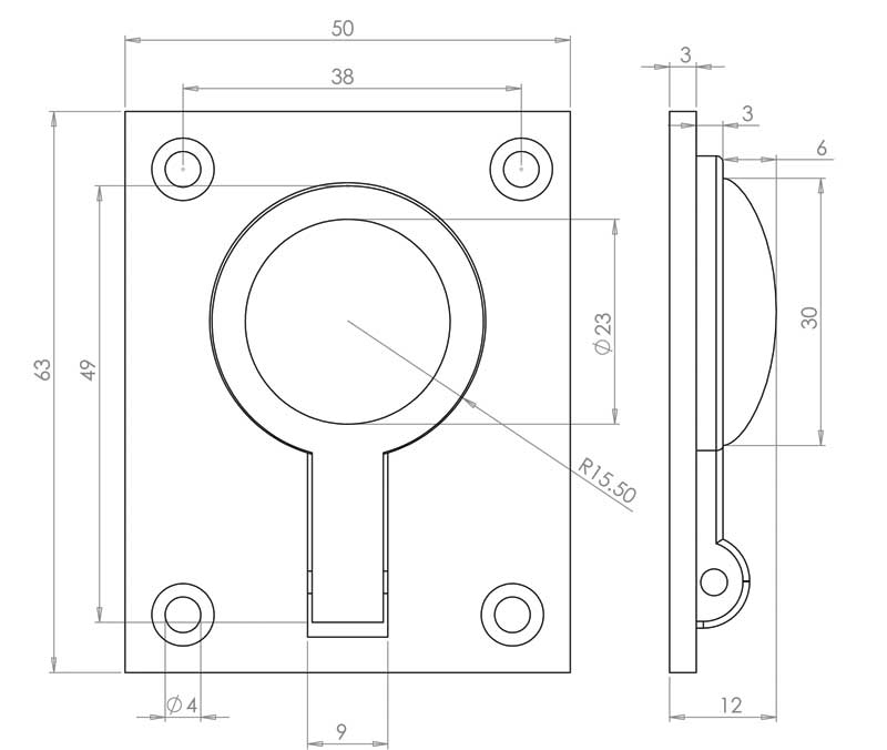The 50 X 63mm Flush Rings from Frelan Hardware are an essential component for any professional or DIY carpentry project. With their robust design and durable construction, these rings are perfect for use in various settings such as cabinets, drawers, or any other piece of furniture requiring a flush fitting. TECHNICAL DRAWING