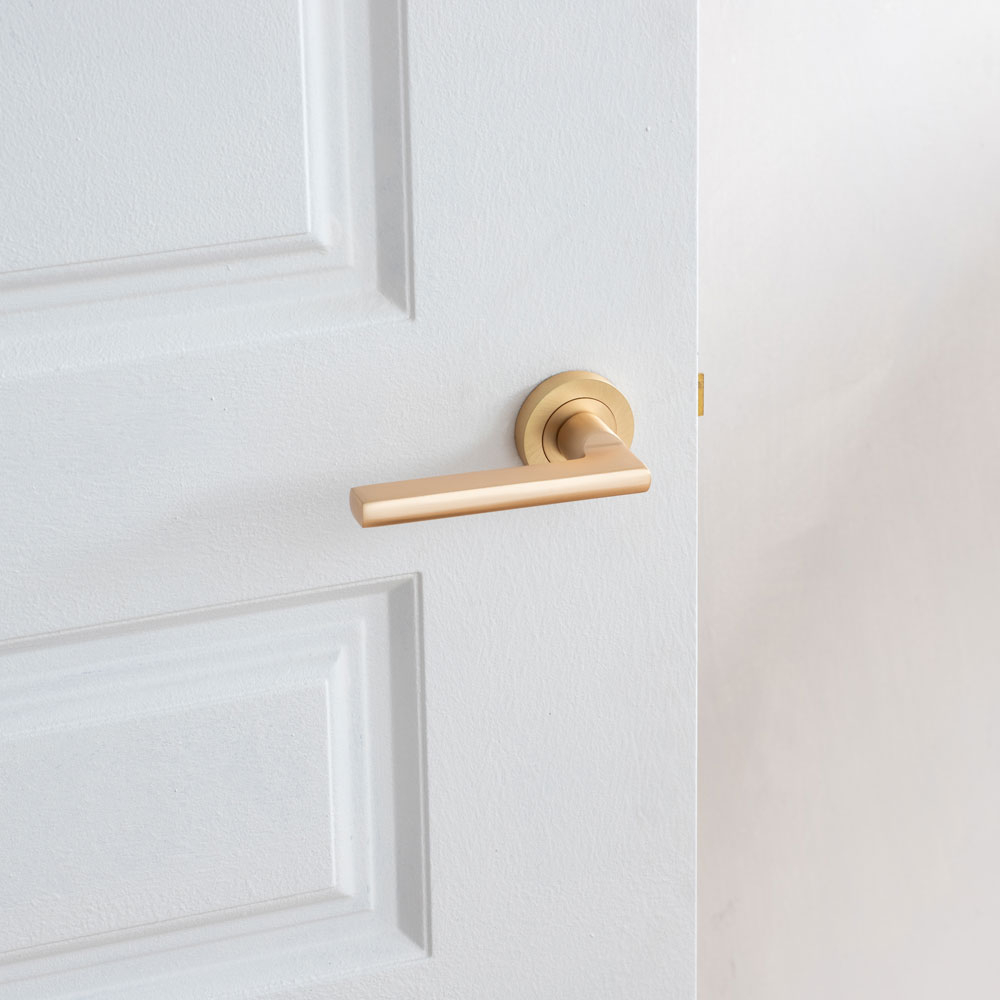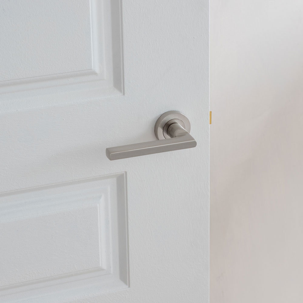 The Jet Lever on Rose, part of the Jedo range, features a modern, minimalistic design with a sleek, flat straight bar. Ideal for contemporary interiors, this durable door handle is sold in pairs.