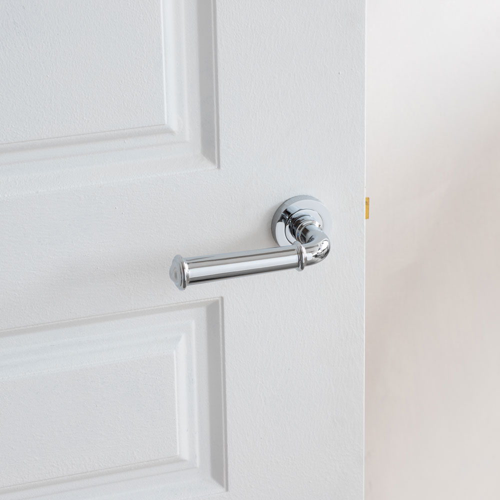 The Classic Lever on Rose from the Jedo range showcases an elegantly elongated handle with a smooth, cylindrical grip that gently tapers towards the end. Ideal for both traditional and modern interiors, these door handles are sold in pairs.